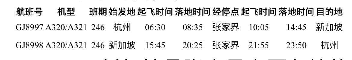 据悉,杭州-张家界-新加坡航班采用空客A320/A321机型,每周二、四、六执行往返航班。具体为:航班号GJ8997/GJ8998,来程航班06:30杭州起飞,08:35到达张家界,10:05张家界起飞,14:45到达新加坡;返程航班15:45新加坡起飞,20:25到达张家界,21:55张家界起飞,23:50到达杭州(以上均为北京时间)。