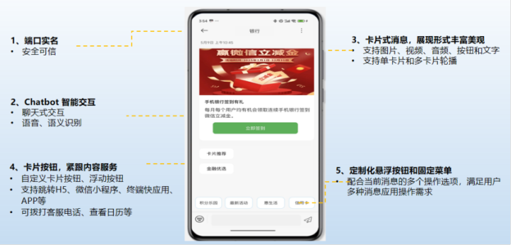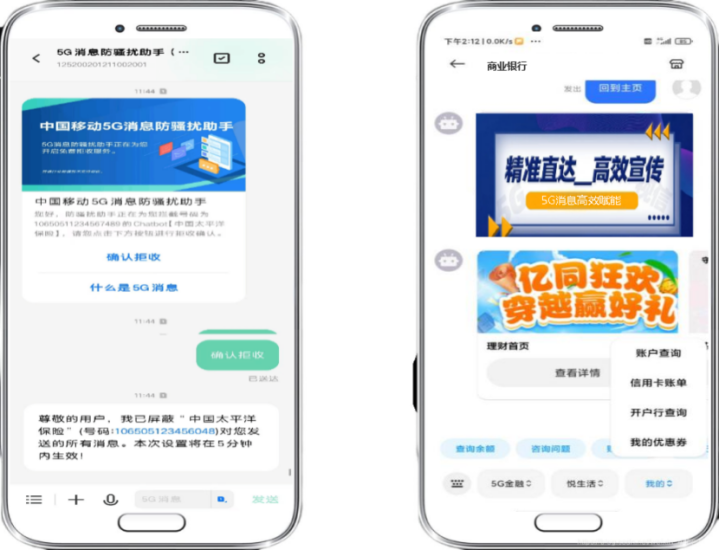 5G消息打破传统服务边界,将服务“嵌入”短信入口,用户在消息窗口内即可完成业务查询、账单管理、理财购买等操作,享受“一站式”便捷服务。结合图文、音视频、Chatbot智能交互等能力,金融服务从“功能式推送”升级为“场景化陪伴”,实现从“人找服务”到“服务找人”的体验升级。