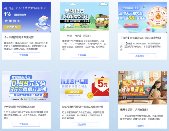 在营销与服务领域,5G消息展现出强大的场景适配能力。山东移动凭借5G消息的富媒体推送与用户画像能力,助力银行实现从“千人一面”到“千人千面”的智能触达,在信用卡促活、理财产品推广、会员关怀等场景中,实现高转化、高互动的精准沟通,构建“精准推送—即时交互—高效转化”的智慧营销新路径。